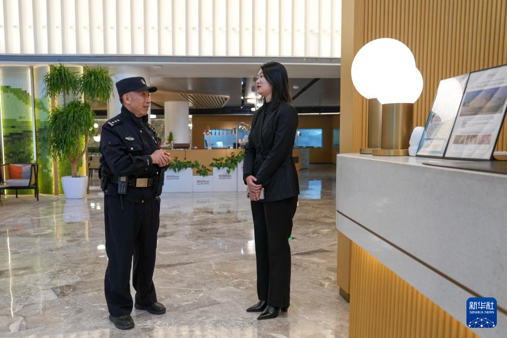 1月8日,民警赵阳(右)在辖区内一物业公司走访。