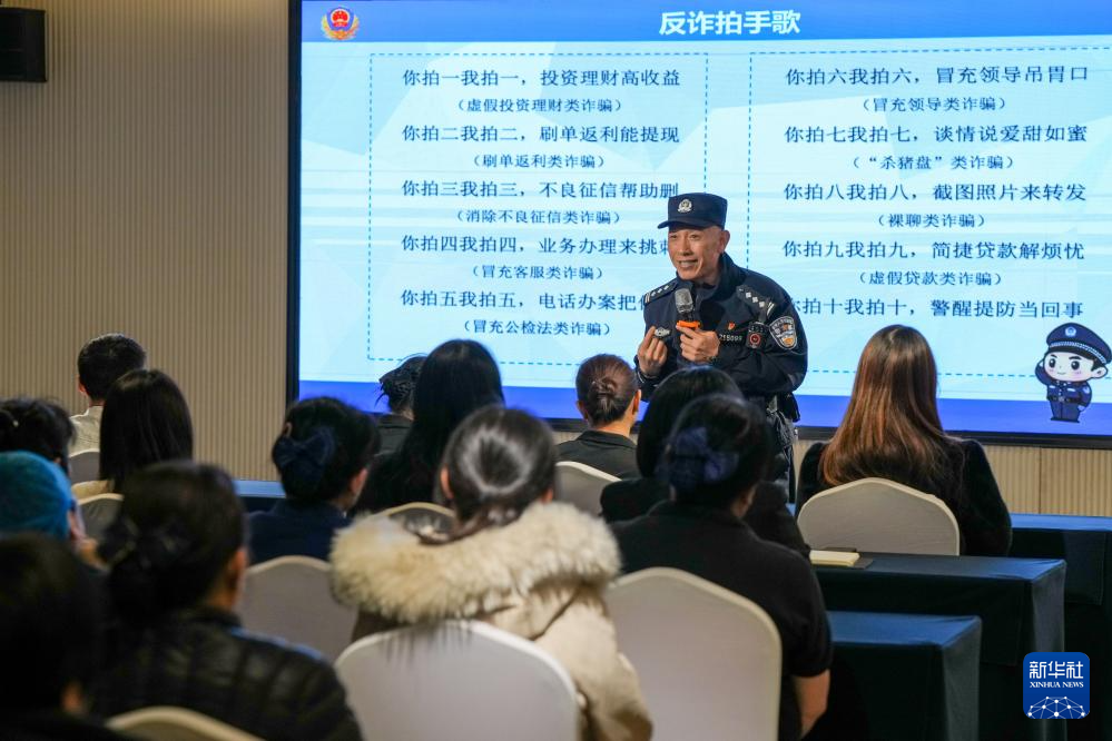 1月8日,民警赵阳在辖区内一家酒店进行安全宣传,向群众推广“防诈拍手歌”。