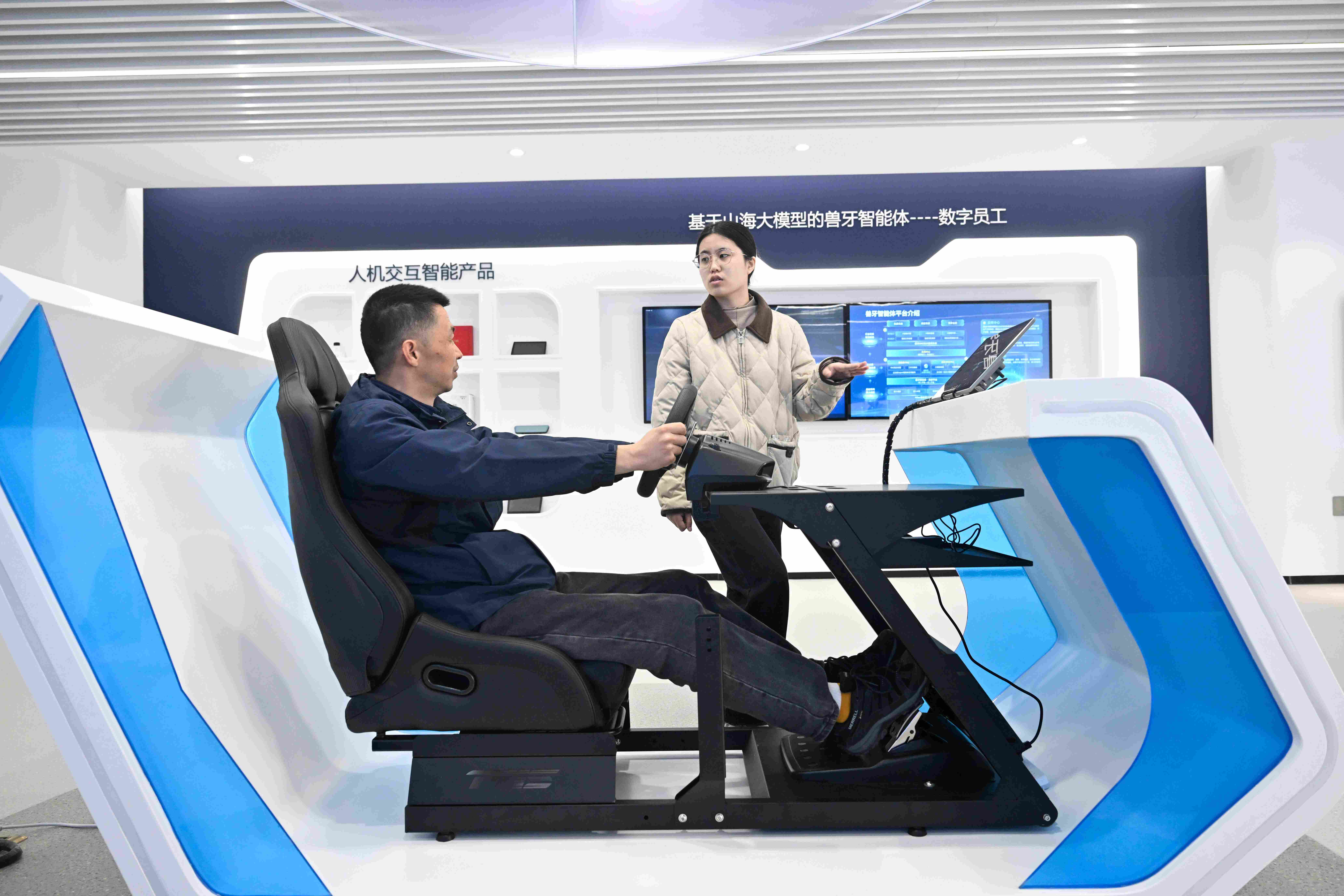 2025年11月28日,在江苏云知声科技有限公司,工作人员(右)介绍一款车载人机交互智能产品。新华社记者 季春鹏 摄