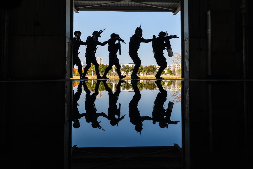 与此同时,搜查二组将另一“嫌疑人”逼入场区空置仓库后,“嫌疑人”负隅顽抗,拒不投降,现场指挥员迅速评估处置方案,果断下令实施强攻。狙击组在外围严阵以待,保持警戒;突击组在门外完成攻击前准备,随后投掷爆震弹掩护突入,最终成功制服“嫌疑人”。民警们配合默契,展现出高超的战斗技能和应急处置能力。