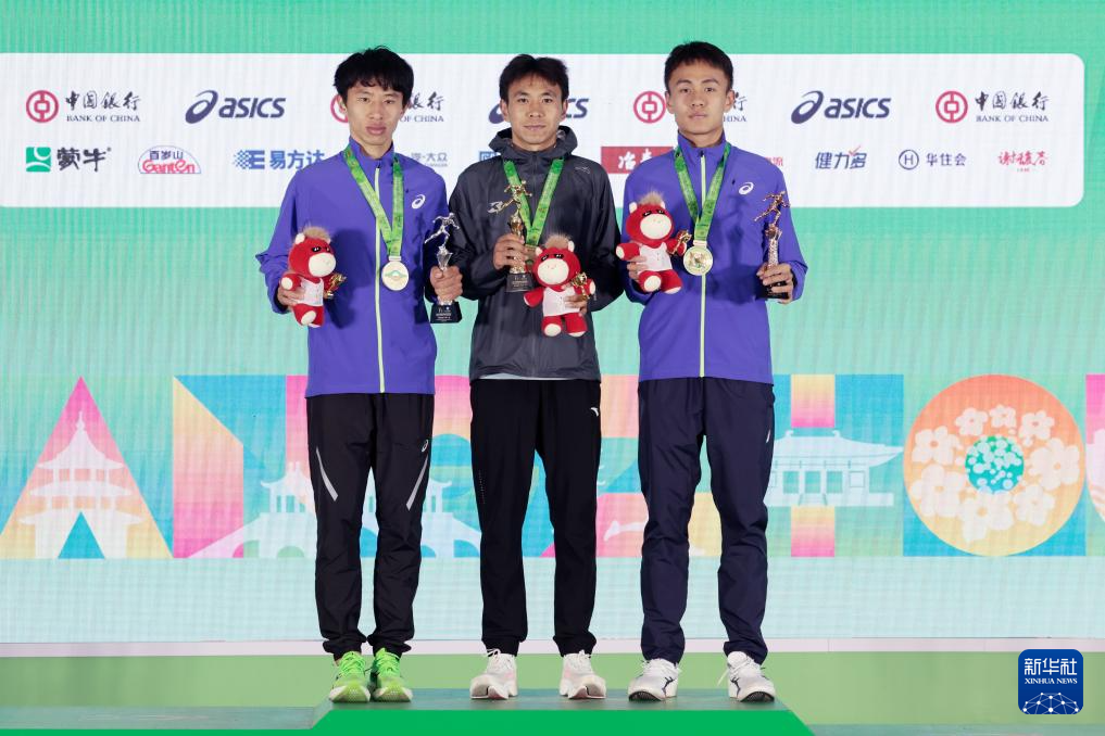 3月29日,男子国内组亚军付奇广、冠军蒋发坤、季军李馨宇(从左至右)在颁奖仪式上合影。